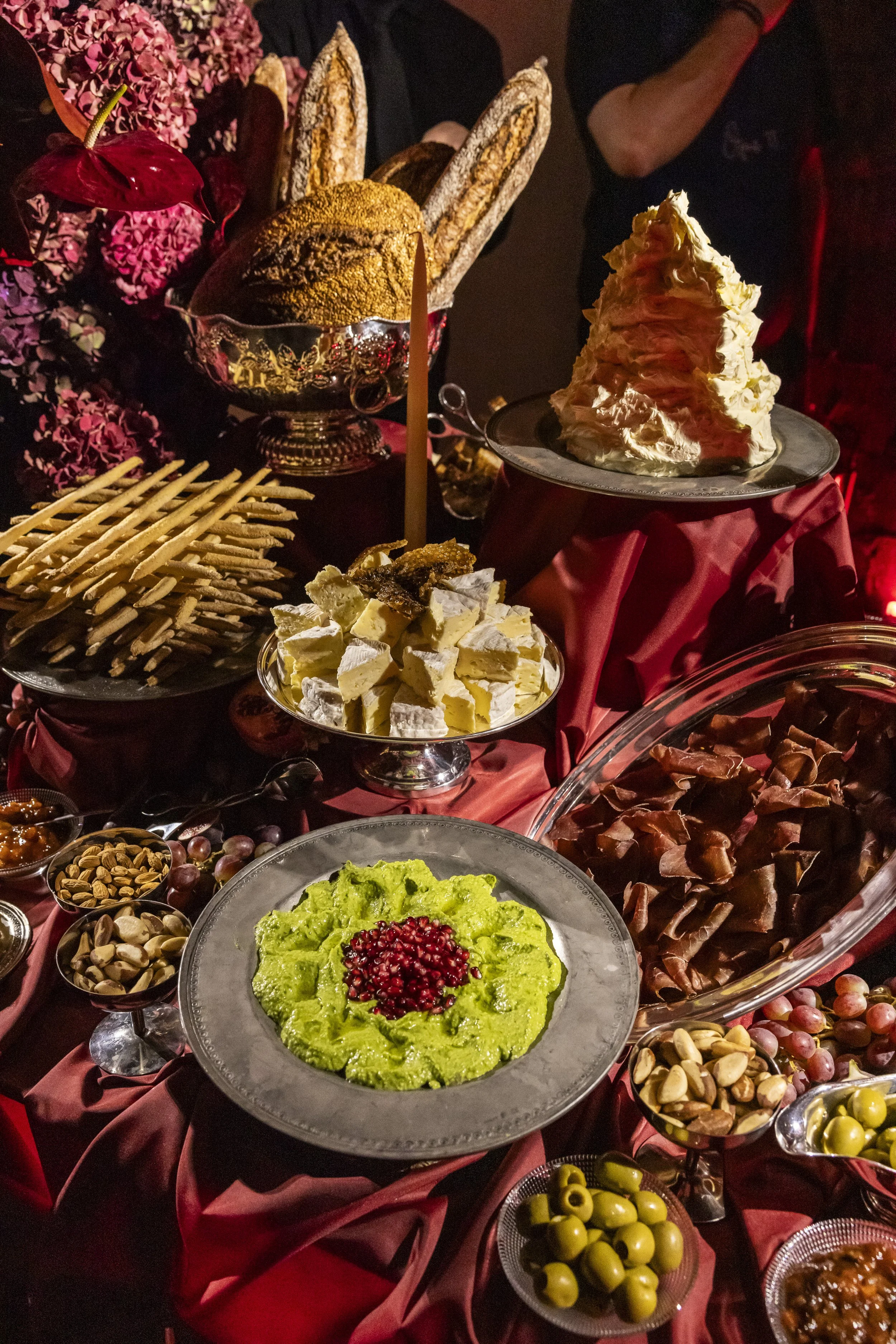 Featured items, such as, seasonal fresh fruit, a selection of artisanal breads paired with cheese, including a 40kg wheel of Parmigiano Reggiano to complete this dramatic tablescape. One of our favourite canapes: sunflower seed cracker, tomato tartare, yellow pepper, and chia seed caviar, to complement the red tablescape.