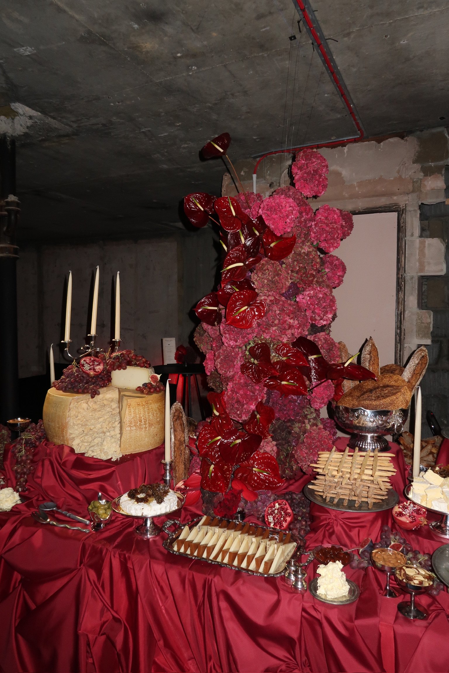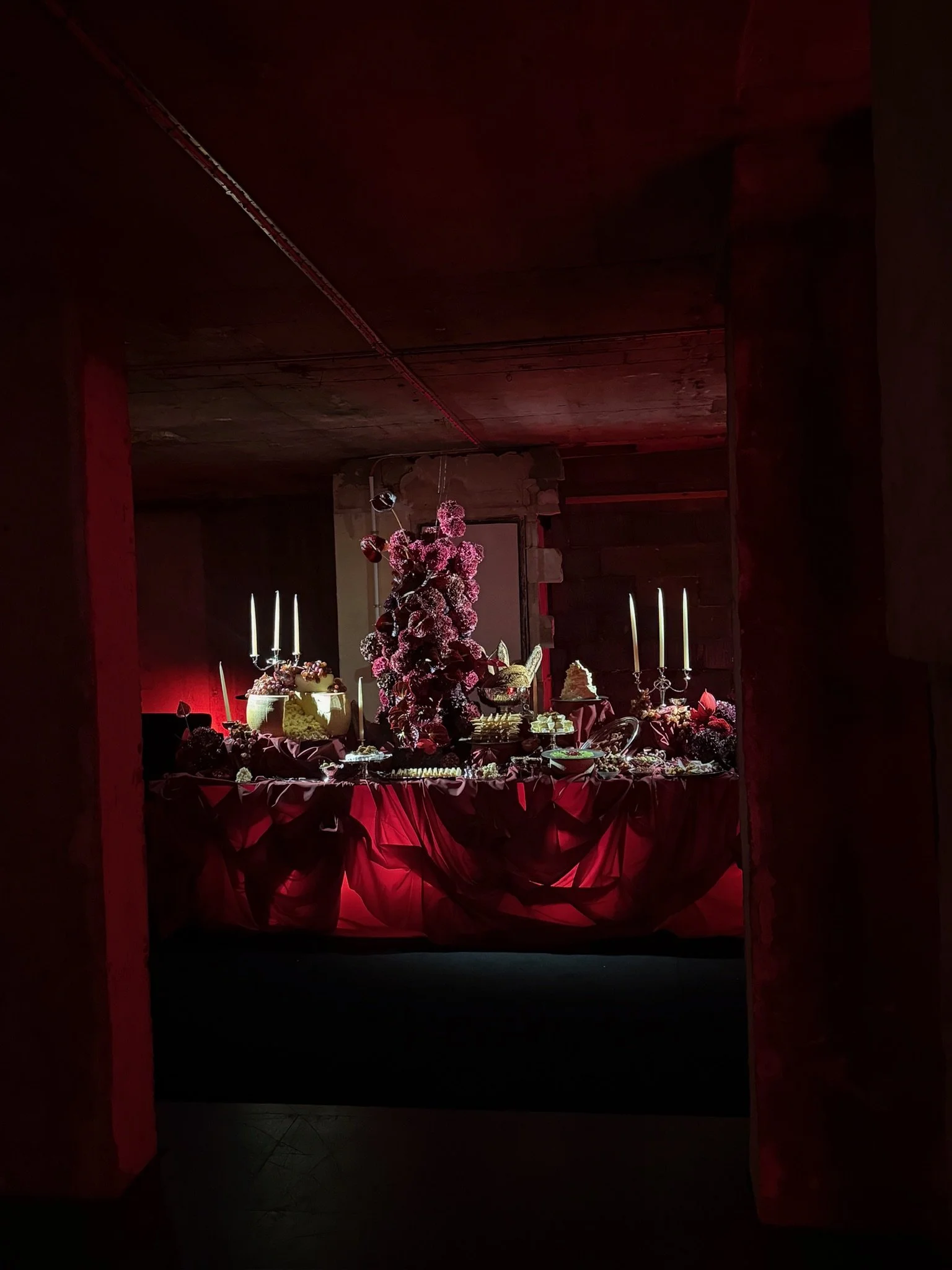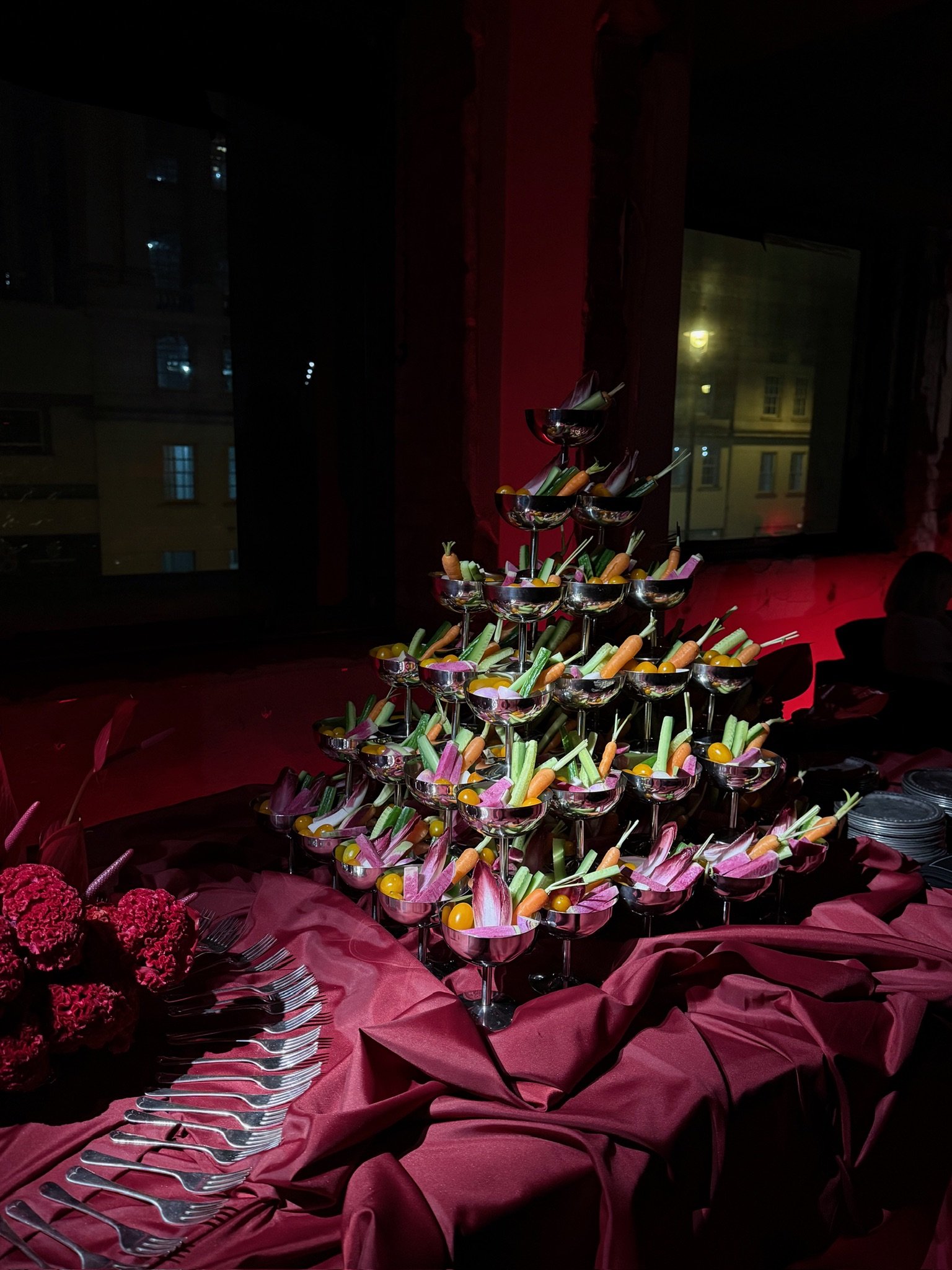 From the striking red draping to the sculptural food displays and theatrical formations, we made sure every element was carefully considered to make the table feel alive. Bold textures and layered heights created something visually arresting, with an immersive centrepiece that felt both wildly dramatic and elegantly refined, setting the perfect tone for an unforgettable premiere experience.